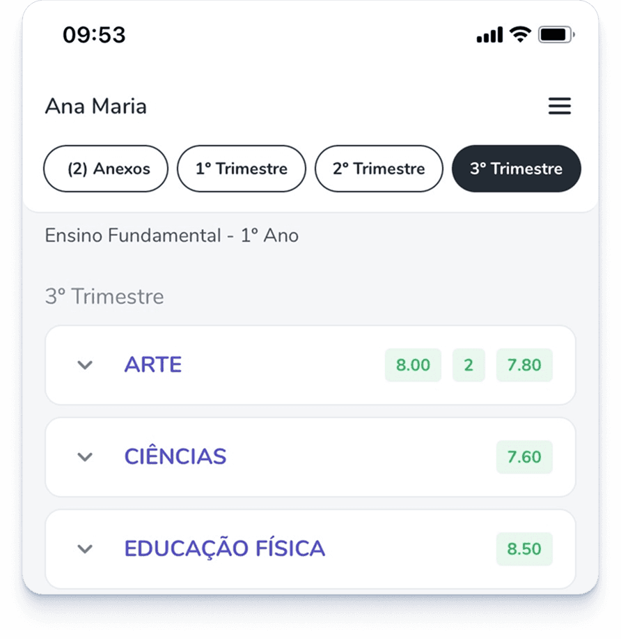As Notas são exibidas de forma simples e transparente, separadas por disciplina e adaptáveis a qualquer modelo de avaliação.