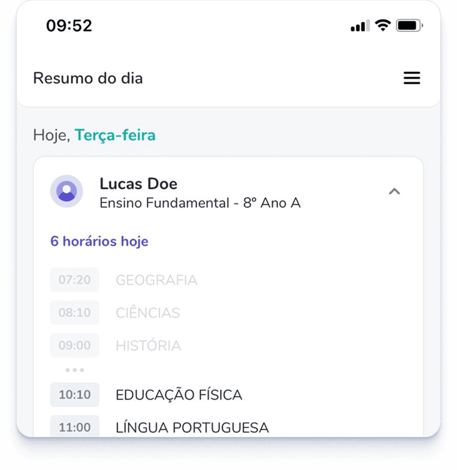 A Visão de Horários exibe a rotina de aulas de forma clara e organizada, adaptada à realidade de cada aluno. Os dados podem vir de diferentes sistemas e são unificados